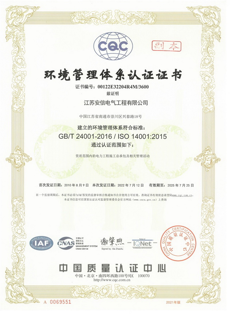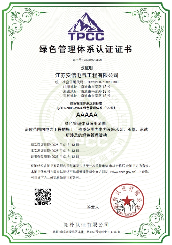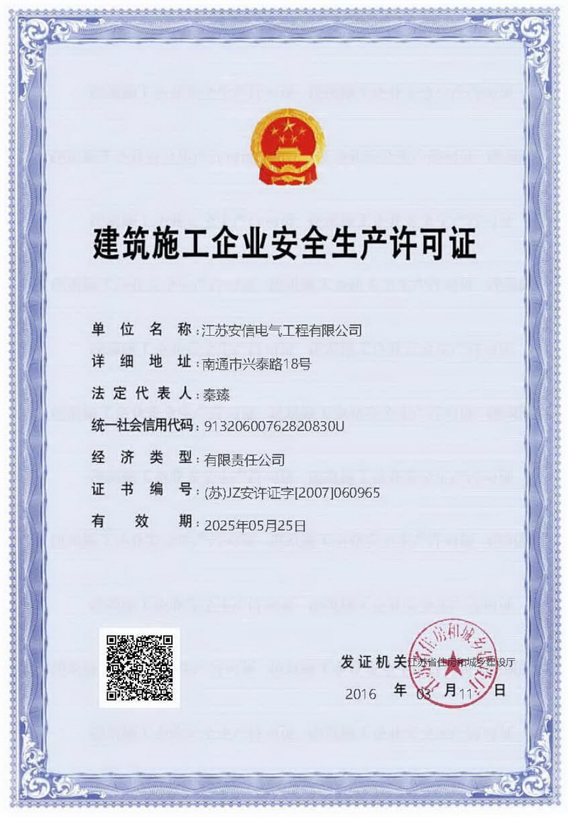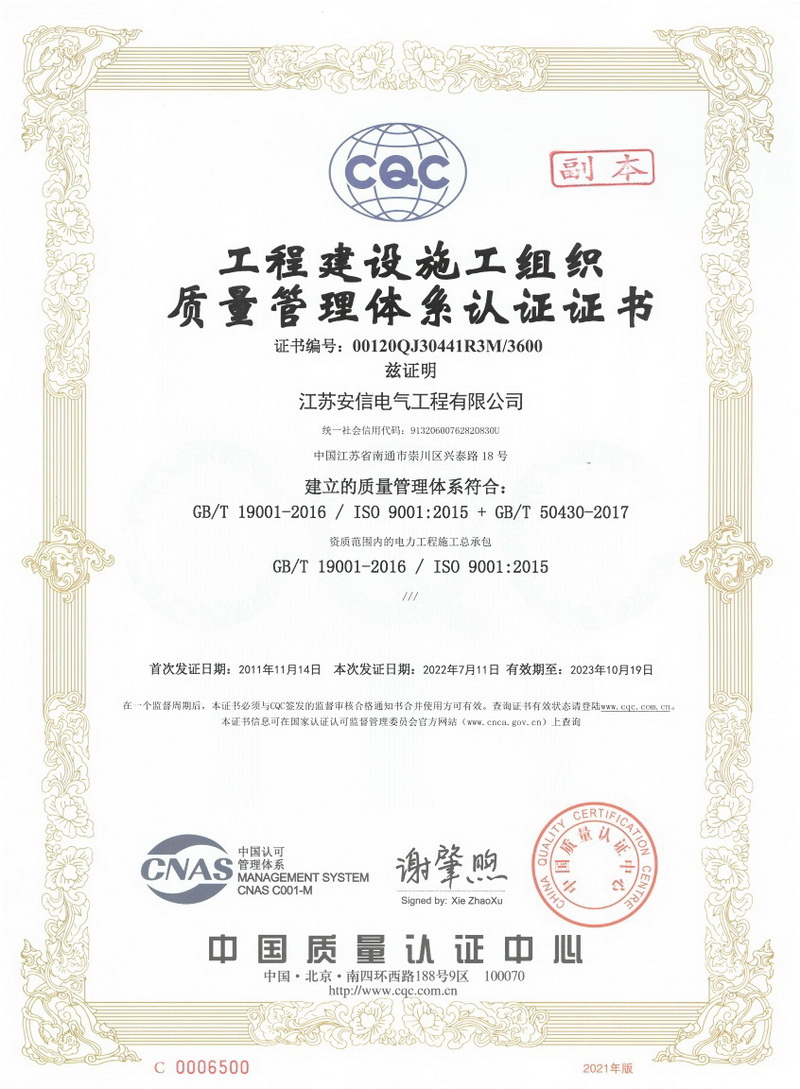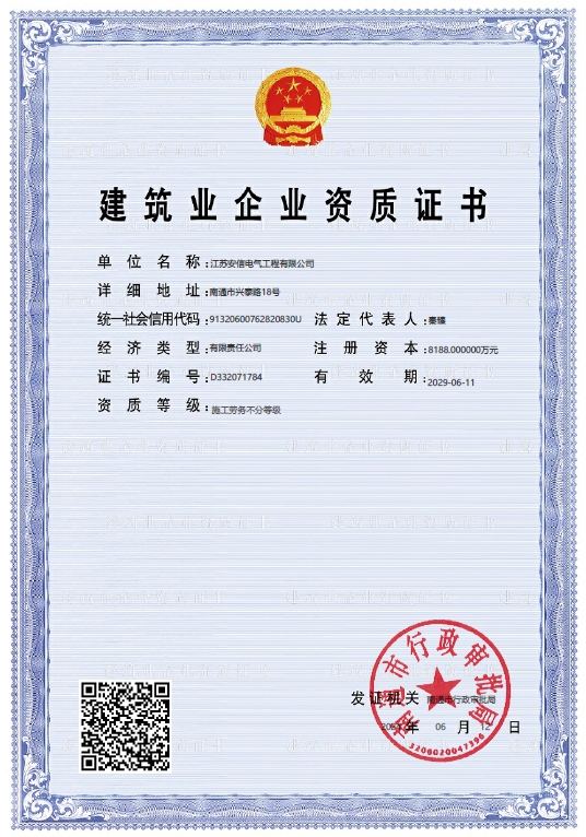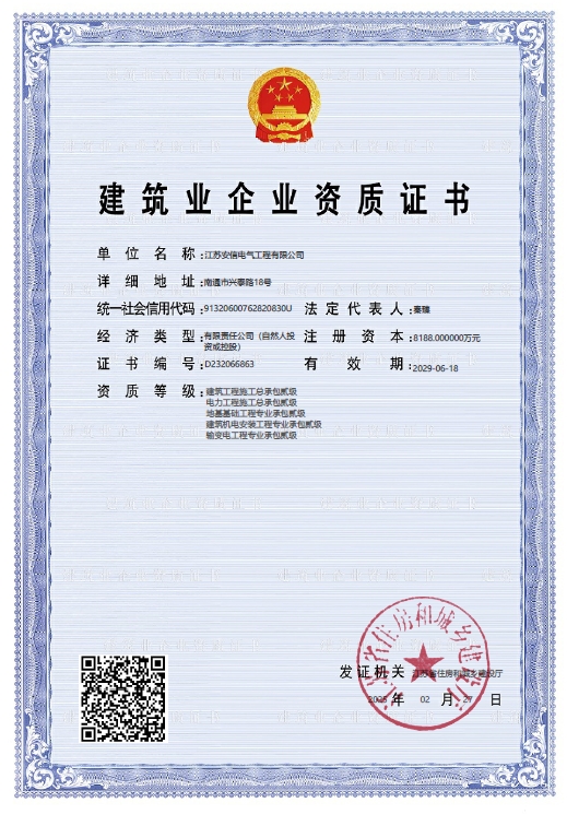 在創(chuàng)業之初,公司就堅持高起點的戰(zhàn)略思路,廣納賢才,集聚行業精英,創(chuàng)新發(fā)展,做優(yōu)企業品牌?,F已取得:承裝二級、承修二級、承試二級,電力工程施工總承包二級,輸變電工程專業承包二級,建筑工程施工總承包二級,建筑機電安裝專業承包二級,地基基礎專業承包二級資質證書,并通過了質量、環(huán)境、職業健康和安全管理體系認證,確保各項工作有序管控。